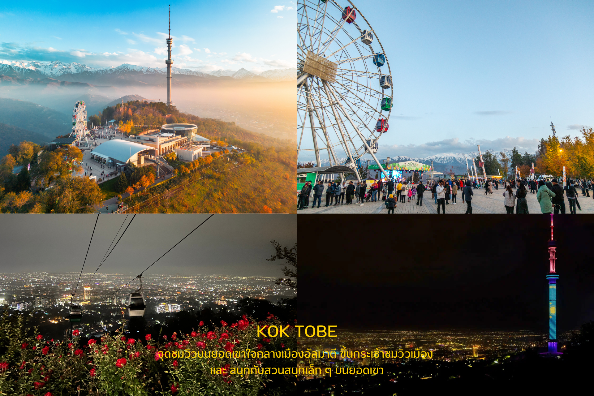 เริ่มต้นการเดินทางที่เมืองอัลมาตี (Almaty) ด้วยการขึ้นกระเช้าไฟฟ้าสู่ โคก โทเบ (Kok Tobe) จุดชมวิวที่สูงที่สุดของเมือง ที่นี่คุณจะได้เห็นภาพเมืองอัลมาตีที่ถูกโอบล้อมด้วยภูเขาเทียนซาน (Tian Shan) สลับซับซ้อนกันอย่างงดงาม โดยเฉพาะในช่วงพระอาทิตย์ตกดิน ท้องฟ้าจะเปลี่ยนเป็นสีส้มอมชมพูสวยงามจับใจ จนคุณต้องยกกล้องขึ้นมาเก็บภาพไม่หยุด