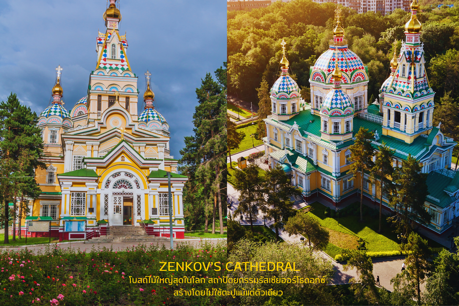กลับมาที่ตัวเมืองอัลมาตีกันบ้าง อาสนวิหารเซนคอฟ (Zenkove Cathedral) หรือที่เรียกกันว่า "โบสถ์ไม้" เป็นสถาปัตยกรรมที่น่าทึ่งมาก เพราะสร้างด้วยไม้ทั้งหมดโดยไม่มีการใช้ตะปูเลยแม้แต่ตัวเดียว ตัวโบสถ์มีสีสันสดใสโดดเด่นสะดุดตา ตั้งอยู่ใจกลางสวนสาธารณะแพนฟิลอฟ (Panfilov Park) ที่ร่มรื่นสวยงาม