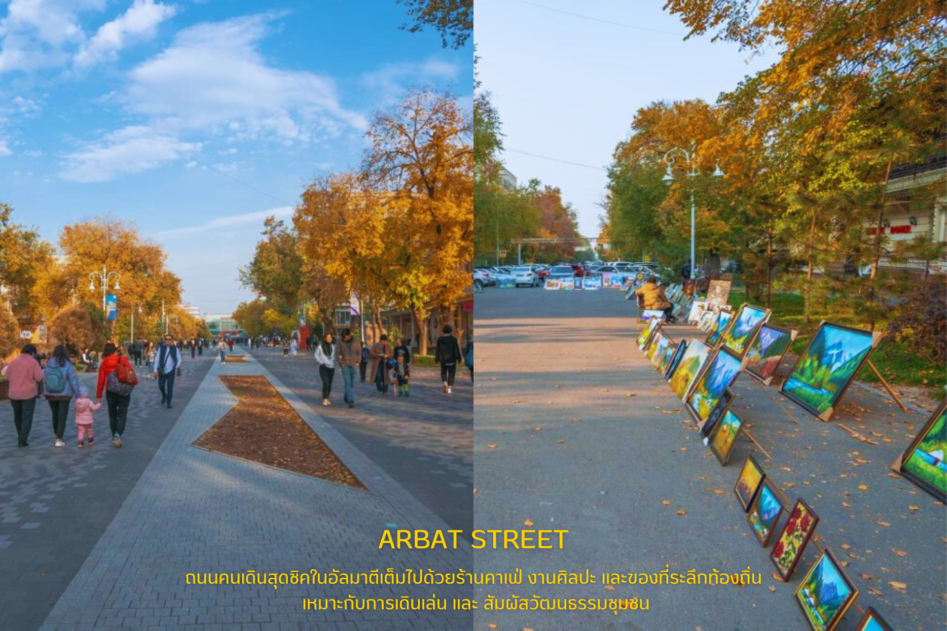 ถนนคนเดินอาร์บัต (Arbat Street) คือย่านที่คึกคักและทันสมัยที่สุดในอัลมาตี ที่นี่เต็มไปด้วยร้านค้า ร้านอาหาร คาเฟ่ และศิลปะการแสดงข้างถนนต่างๆ เป็นสถานที่ที่เหมาะกับการเดินเล่นในช่วงเย็นเพื่อซึมซับบรรยากาศความมีชีวิตชีวาของเมือง